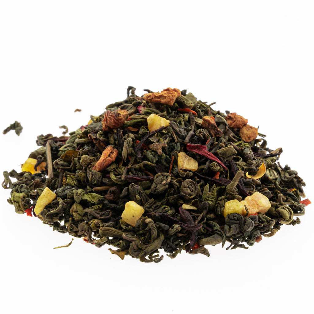 Green gunpowder tea 84%, hibiscus 5%, papaya pieces 5%, apple pieces 3%, fruity aroma 2%, lily petals 1%